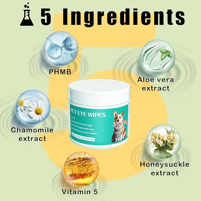 - Hypoallergenic & Naturally Soothingβ - Our pet eye wipes are infused with aloe vera, chamomile, and honeysuckle extracts to effectively combat eye irritation, remove tear stains and crusts, while neutralizing odors. Free from alcohol, dyes, and harsh chemicals, these gentle wipes are safe for all dogs' delicate eye and facial areas.