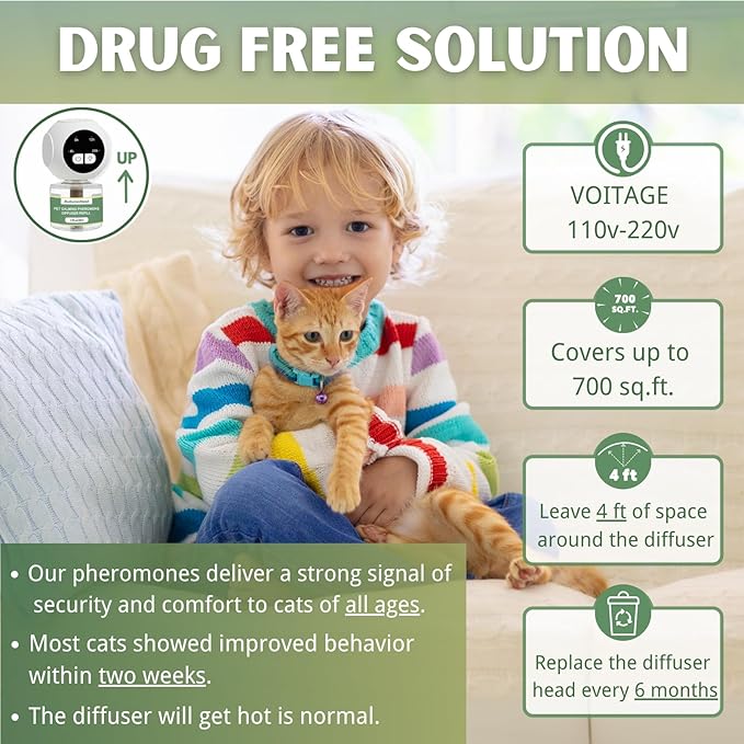 - 【Natural Pheromone Formula – Noticeable Calm in 14 Days】 This diffuser mimics mother cat pheromones to provide a safe, familiar environment. Supports stress reduction for urine marking, scratching, hiding, and over-grooming. Gentle, non-irritating formula helps cats adapt more peacefully.