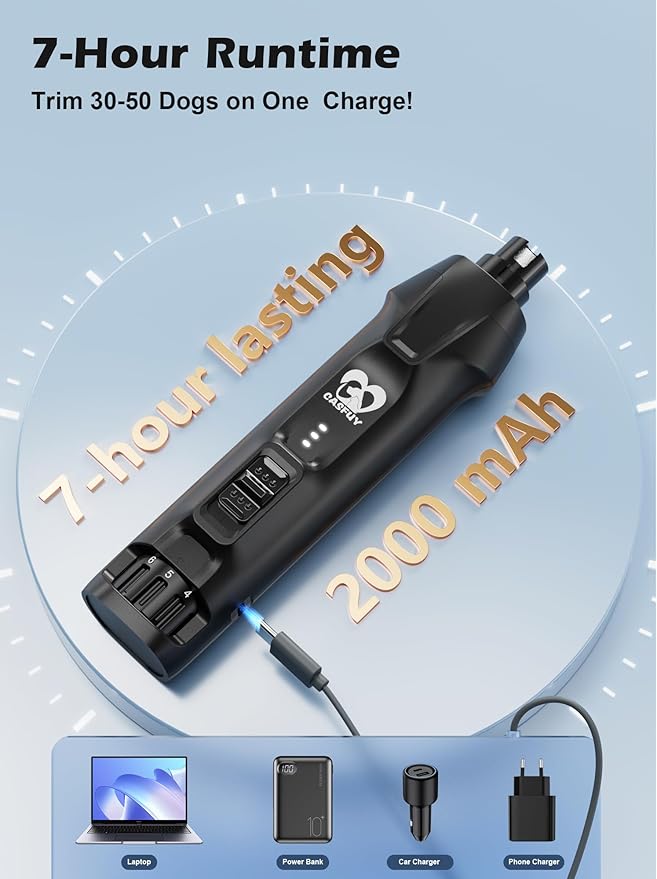 - 【7-Hour Runtime—Groom 30-50 Dogs】Powered by a 2000mAh lithium-ion battery, this nail drill for dogs delivers up to 7 hours of continuous use—even at max 12,000 RPM. That’s enough power to trim 30-50 dogs on a single charge! The universal Type-C charging (110V–220V) makes it perfect for home, salon, or travel use.