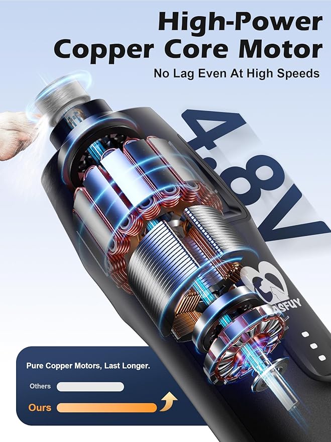 - 【4.8V Copper Core Motor - No Lag, More Power】Enhanced with 50% more torque, our powerful dog nail trimmer easily handles thick, tough nails. The durable copper core delivers smooth, stable grinding for an effortless grooming experience—even at high speeds—without stalling or slowing down.
