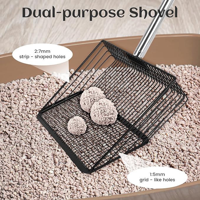 - Dual-function shovel surface design: The strip chicken coop rake surface handles large solid manure, and the mesh shovel surface filters fine debris. The coop poop buster is ideal for separating litter and manure, whether it is wet manure or dry shavings, it can easily handle it