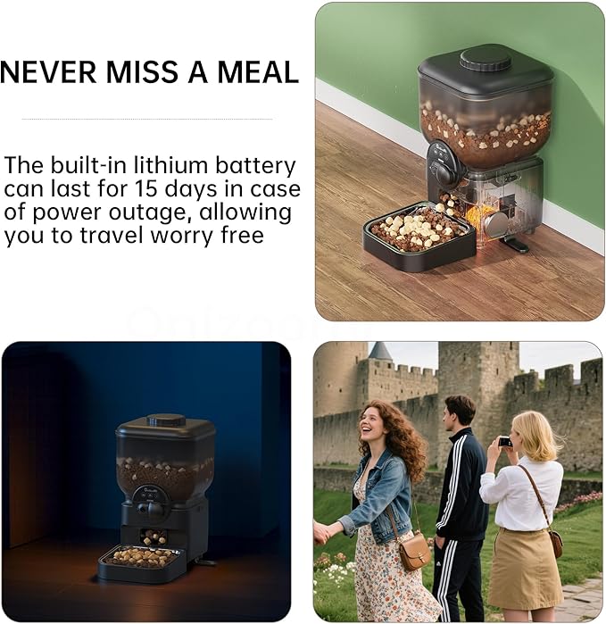 - Ensures Continuous Feeding with Dual Power Sources : USB and Rechargeable Battery This electric auto feeder uses dual powerβUSB or battery-backup operated (provides power supply for 15 days ). Ideal for outdoor/indoor use, power outages, on business trip or travel.The gravity-based dispensing system ensures a steady food delivery even during power outages.