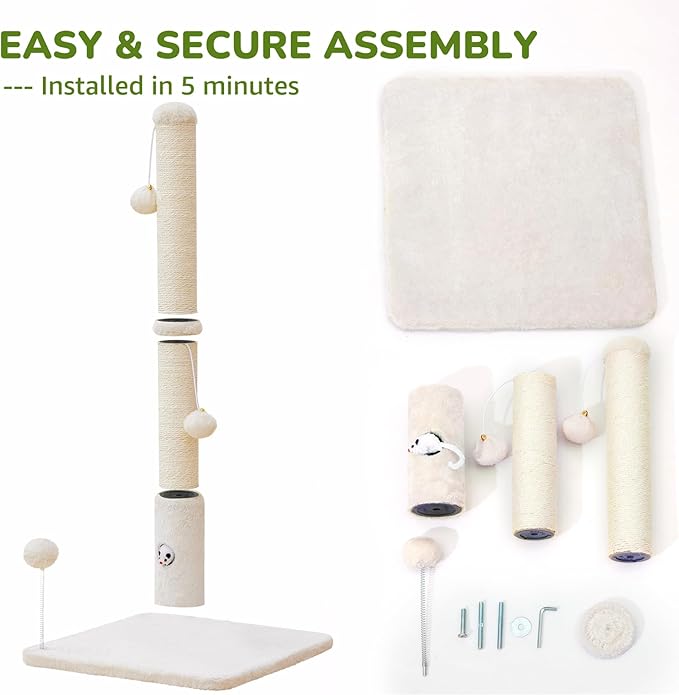 - 【Easy To Install With Full Tools】: Scratch posts for indoor cats can be DIY installed. Very easy to assemble, the assembly process is simple and quick, including screws and wrenches.