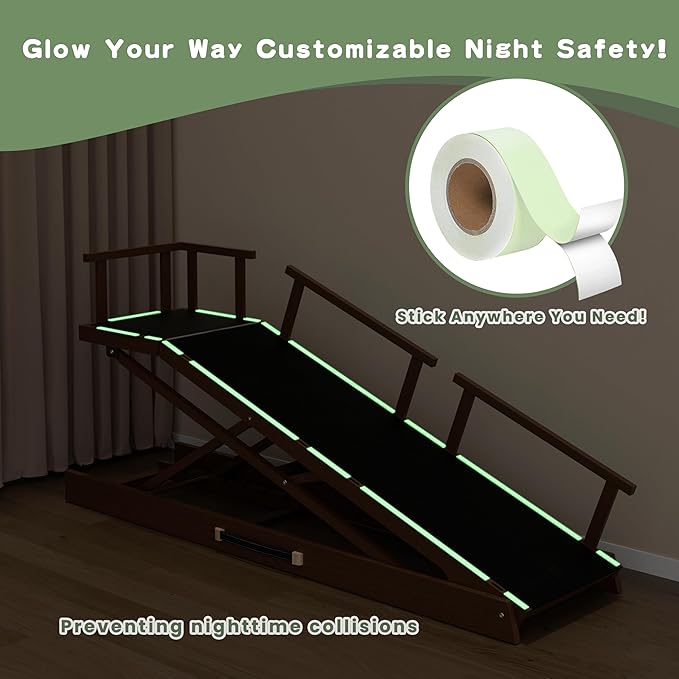 - š”ļø Triple Safety System Seamless removable guardrails (3 side panels) prevent falls, paired with Anti-Slip Anchor Straps to secure ramp base. Includes DIY glow strips for enhanced nighttime visibility and safety.