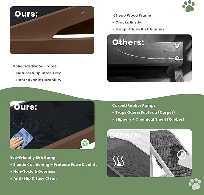 - š¾ EVA Non-Slip Dog Ramp Surface Upgraded EVA mat offers superior traction, odor-free cushioning for paws, and gentle joint support. Easier to clean than rubber or carpet competitors.