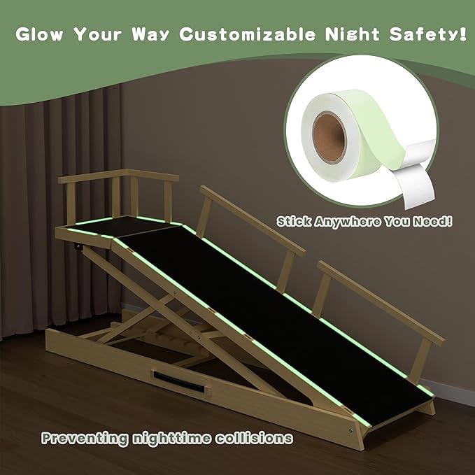 - 🛡️ Triple Safety System Seamless removable guardrails (3 side panels) prevent falls, paired with Anti-Slip Anchor Straps to secure ramp base. Includes DIY glow strips for enhanced nighttime visibility and safety.