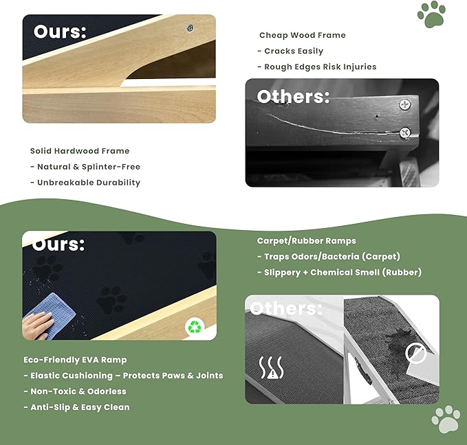 - 🐾 EVA Non-Slip Dog Ramp Surface Upgraded EVA mat offers superior traction, odor-free cushioning for paws, and gentle joint support. Easier to clean than rubber or carpet competitors.