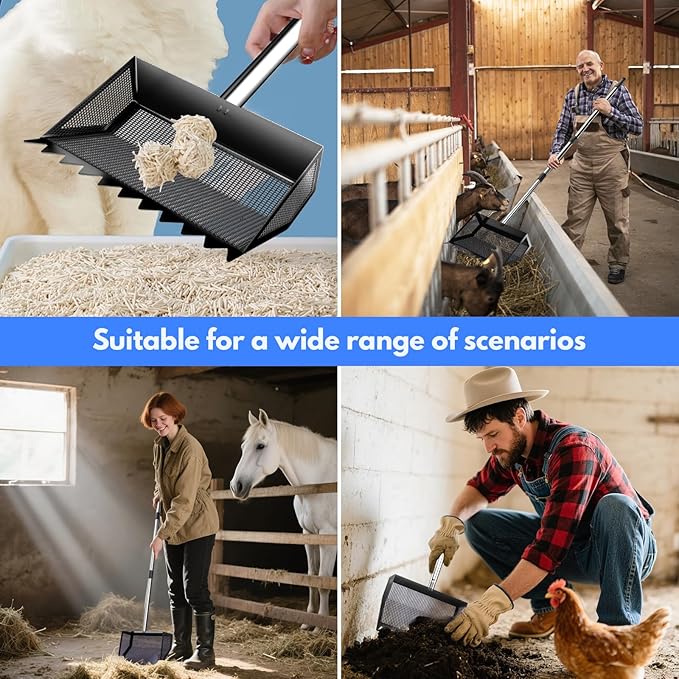 - Multi-Purpose Chicken Poop Scooper: Not only can it be used as a chicken manure shovel, but it can also serve as a cat litter shovel, beach sand shovel, and cattle pen shovel. What sets this chicken coop shovel apart is its rake teeth, enabling quick removal of chicken manure and other waste. The shovel's mid-section features a 0.3-foot aperture for effective waste screening, ensuring thorough cleaning.