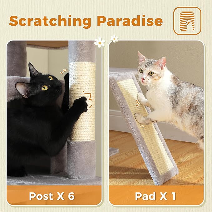- Ultimate Scratching & Play Center: Designed for large adult cats, this Big cat tree features 6 durable sisal-covered scratching posts, a 2-in-1 scratch pad runway, and 2 dangling toys with 1 bonus replacement ballβperfect for active play and claw care. A cozy round basket hammock and spacious double-door condo offer ideal spots for lounging and napping.