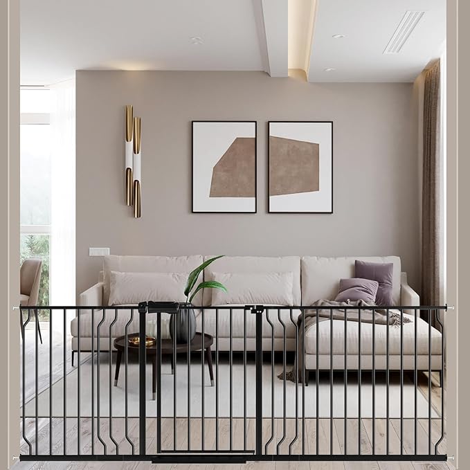 - 【Safe for Baby】Your curious crawlers will be "blocked" by the safety extra wide baby gate because we design the double-lock safety release which makes it difficult for toddlers to open the gate ,but adults can operate with one hand and pass quickly.