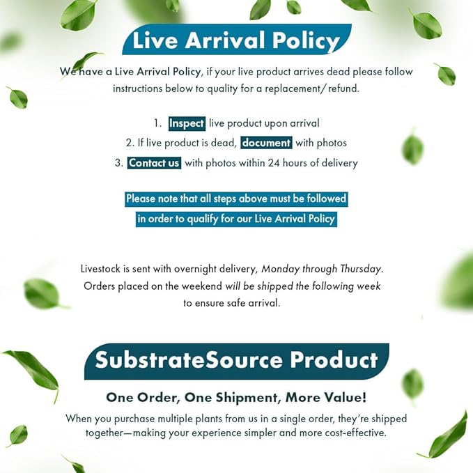 - SubstrateSource inspects each plant prior to shipping and ships all plants in healthy, stable condition with proper packing materials to ensure its safe arrival during shipping. Each plant is backed with a 100% dead-on-arrival replacement guarantee. To qualify, customers must provide a photo of the DOA plant within 24 hours of delivery.