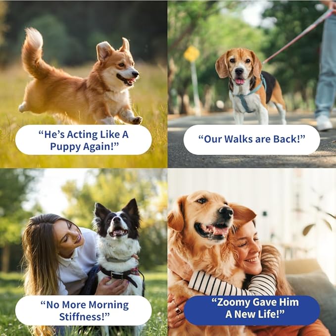 - Real Results You Can See: Customers report tails wagging on longer walks, dogs leaping into cars without hesitation, and seniors rediscovering puppy-like play. Zoomy makes “too tired” and “too stiff” a thing of the past.
