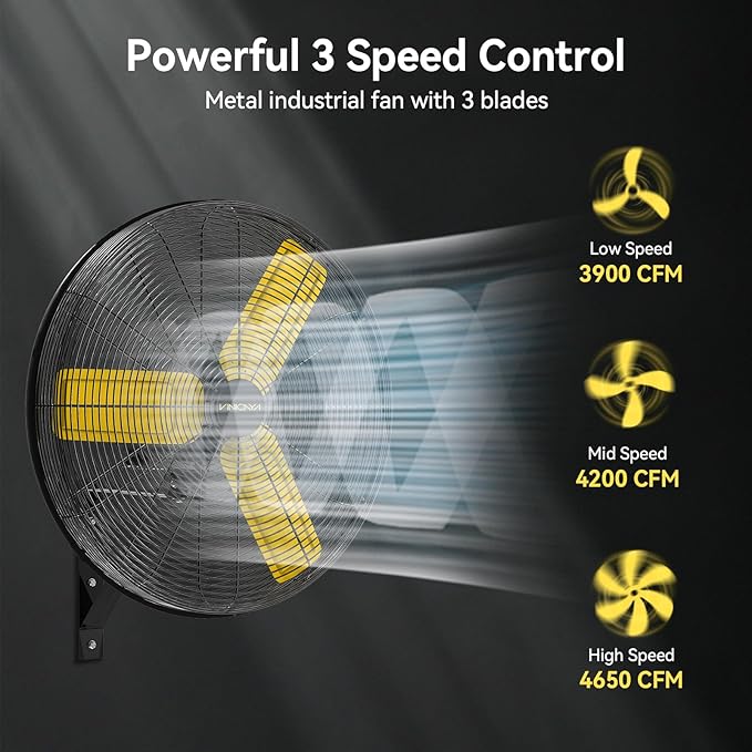 - 3 Speed Control: Offers three speed settings (low-7000 CFM, medium-7400 CFM, and high-9000 CFM) to allow you to customize the airflow intensity based on your specific cooling or ventilation requirements on the wall mount fan