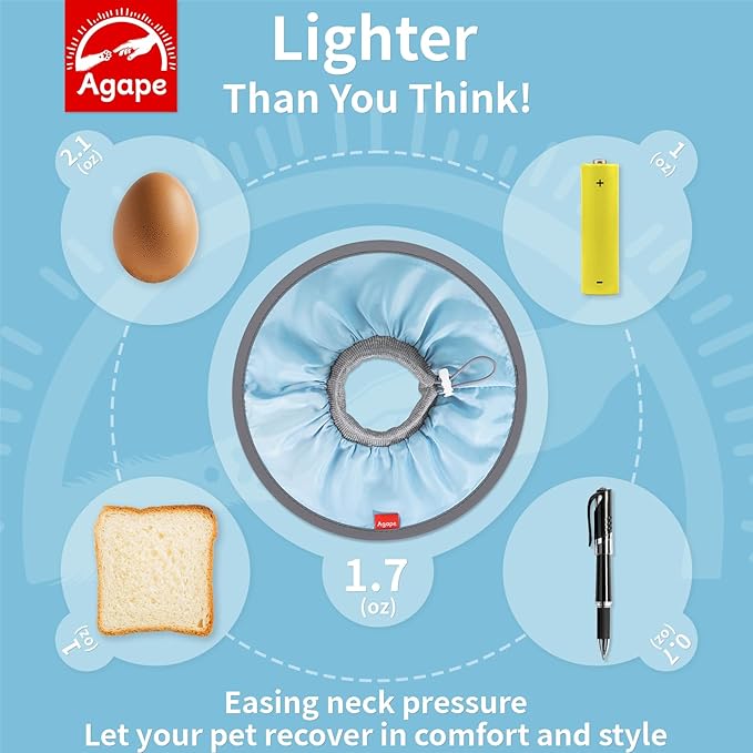 - 【Soft & Lightweight】Unlike bulky, uncomfortable cones on the market, Agape's cat cone is made with two layers of silky fabric and a ribbed knit collar, weighing just 1.7 ounces—about the same as two single AA battery. This ultra-light, breathable, and soft design ensures your cat can sleep peacefully and comfortably, without feeling any strain or restriction around their neck