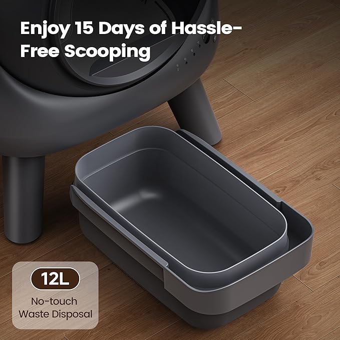 - Fewer Cleanups, More Convenience: Designed for busy cat parents, this self-cleaning system includes a spacious 11L waste bin that can hold up to 14 days of waste for a single cat. Eliminate daily scooping with this hands-free design that keeps the litter box consistently tidy, enhances your cat’s comfort, and simplifies your routine. Enjoy a cleaner home and more free time with this smart, low-maintenance solution.