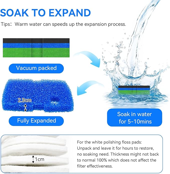 - Soak to Expand - The pond filter media pads are vacuum-sealed for easy shipping, so they may appear thinner upon unpacking. Simply soak them in water for 5β10 minutes, and they will return to their original size without affecting performance.Warm water can speeds up the expansion process.