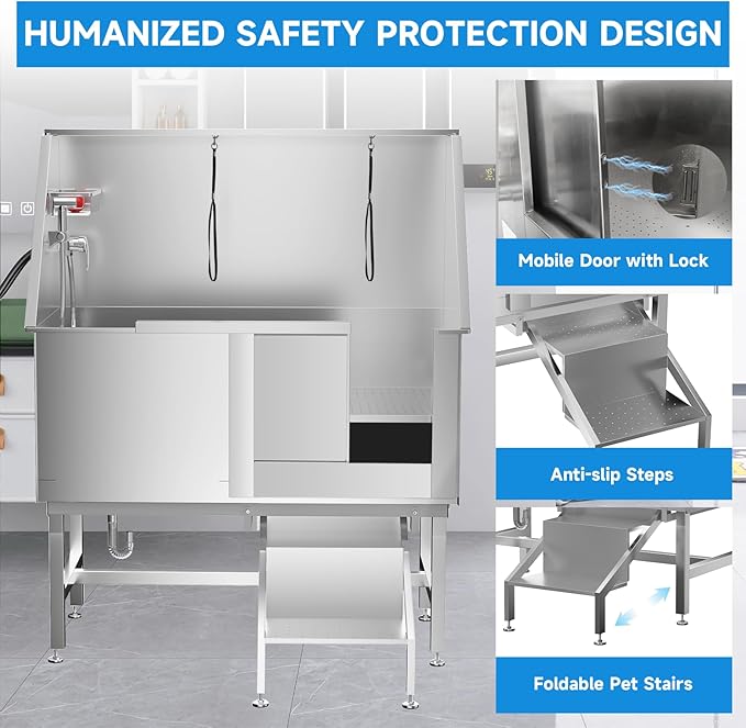 - 【ANTI-SLIP STAIR & GRID】Our dog wash station can be easy to use while offering security. Pet tub with a pet stair featuring a non-slip texture on the surface, allowing your pets to safety climb and play.